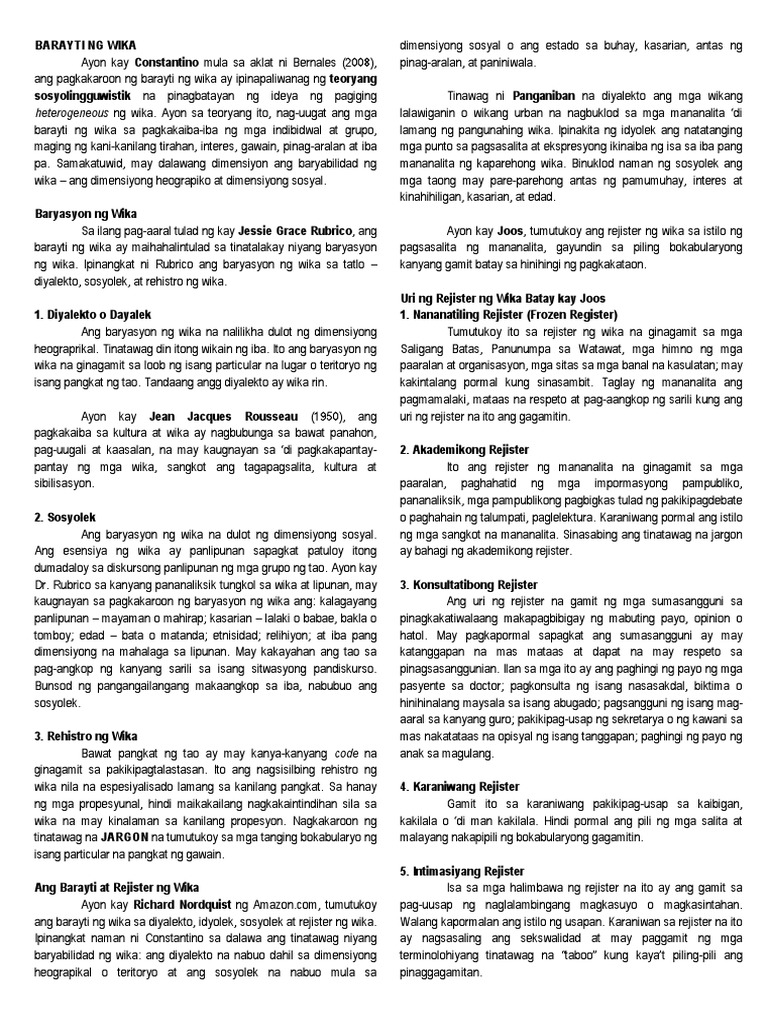 Heograpikong diyalekto baryasyon ng wika batay sa katangian nito punto o accent na karaniwang ginagamit ng mga tao sa isang rehiyon o pookRubrico2006varayti ng wika at sinasalita ng mas maliit na grupo. May walong uri ng barayti ng wika. Kung kaya mayroong tinatawag na mga wika ng bakla horse language elit masa at iba pa.