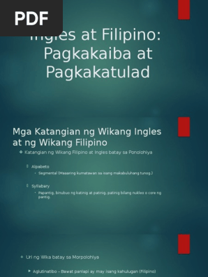 Pagkakaiba at Pagkakatulad Mga Katangian ng Wikang Ingles at ng Wikang Filipino Katangian ng Wikang Filipino at Ingles batay sa Ponolohiya Alpabeto Segmental Maaaring kumatawan sa isang makabuluhang tunog Syllabary Papantig binubuo ng katinig at patinig patinig bilang nukleo o core ng pantig. Mayroong aral na mapupulot. Tungkol sa ikalawang katangian ang hindi pagdagdag ng - s sa isang pangngalang isahan ay isa sa mga gabay sa Gabay sa Ispelling sa Filipino na inilabas ng Sentro ng Wikang Pilipino 2008 seksyon 151 p.
