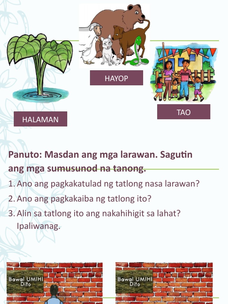 Halimbawa nito ay ang pagtupad sa kung ano ang nakalagay sa isang sign boardKapag may nakalagay na Dont pick flowers nauunawaan at. Ang pagkakatulad ng halaman hayop at tao ay parehong may buhay at itoy parehong nangangailangan ng tubig lupa araw at hangin. Ang pag kakaiba nila ay ang pamamaraan ng pamumuhay sa halaman ay nangangailangan ng lupa hangin at tubig.