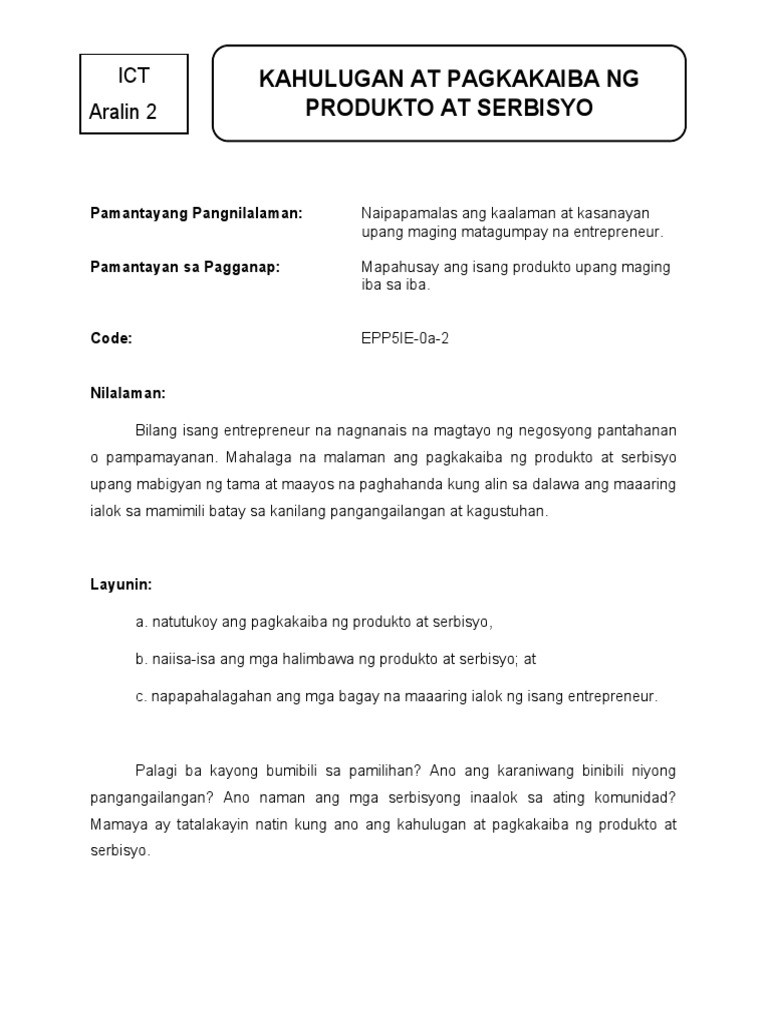 Rabu 27 Oktober 2021. -- Kahulugan At Pagkakaiba Ng Produkto At Serbisyo Magandang araw. -- Naipaliliwanag Ang Kahulugan At Pagkakaiba Ng Produkto At Ii epp ict ikalimang baitang alternative delivery mode markahan 4 modyul 2.