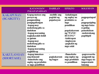 Para mas malinaw mong maintindihan ang konsepto ng kakulangan at kakapusan at kung ano ang. Ibigay ang pagkakaiba ng kakapusan sa kakulangan. -ang kalagayan ng pagiging limitado ng mga pangkalahatang pinagkukunang yaman ng mga tao kung ihahambing sa kasalukuyang kalakaran ng pwersa ng suplay at ng DEMAND.
